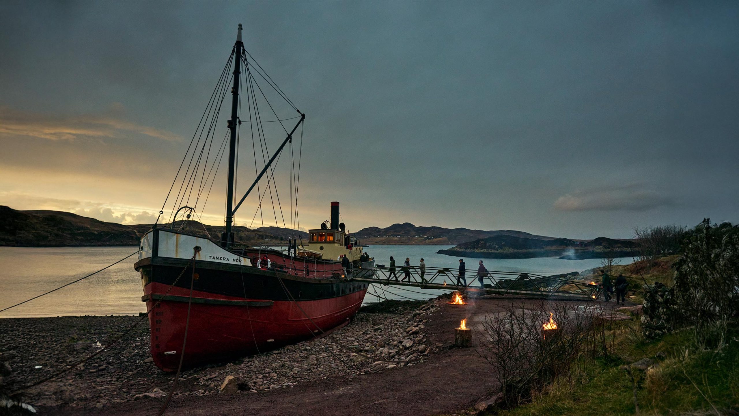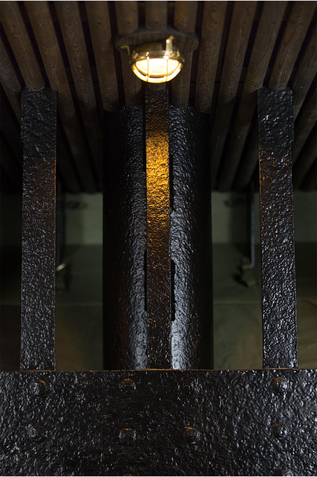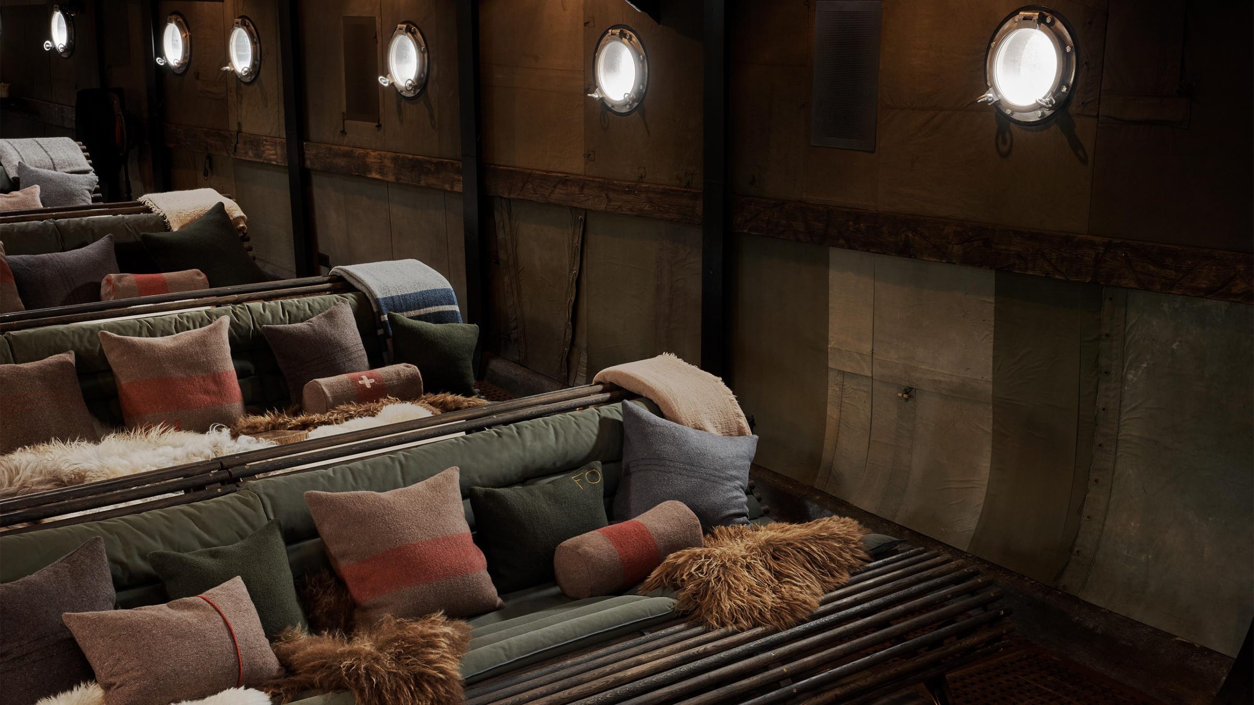 The cavernous cargo hold was opened up and reimagined as a unique cinema. A stage was designed to follow the sheer and curves of the ship. Handcrafted seating was built to match the lines of the hull and finished with base cushions made from reclaimed army tent canvas and sheepskin rugs. The engine was fully restored and set beneath a central staircase built by Calshot’s fabrication team. The entire space was decked in reclaimed timber.